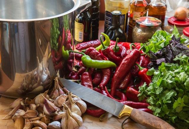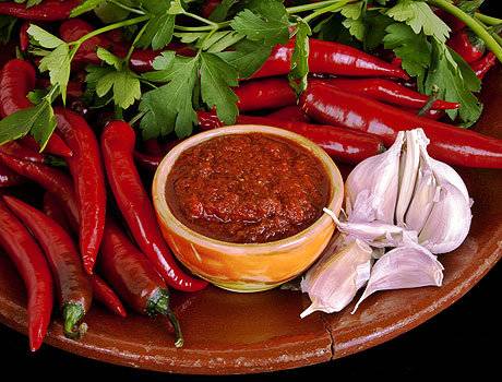 Um Adjika nach dem kaukasischen Rezept zuzubereiten, benötigen wir folgende Zutaten: Imeretischer Safran, sehr scharfer Pfeffer, Knoblauch, Koriandersamen und -grün, Suneli-Hopfen, Weinessig, Walnüsse und Salz.