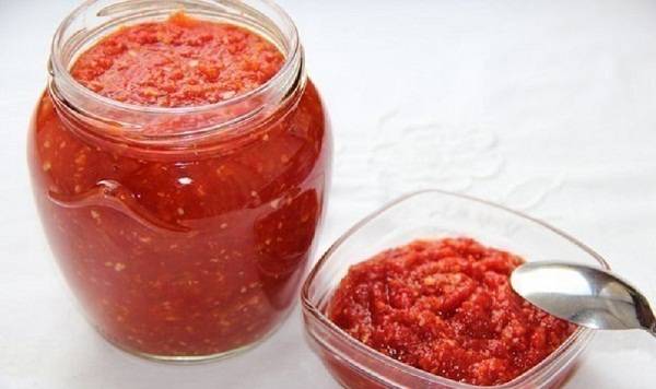 Nach der Tradition wurden Tomaten nicht in das Rezept aufgenommen, aber im Laufe der Zeit wurden sie allmählich in dieses Gericht eingeführt. Seien Sie nicht überrascht, wenn Sie auf Adjika-Rezepte mit einer Fülle von Tomaten stoßen. Sie werden verwendet, um Saftigkeit hinzuzufügen.