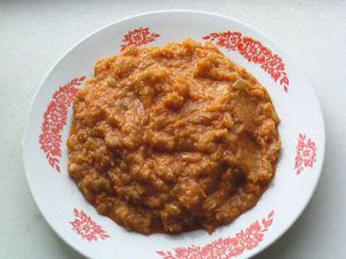 Nach Zugabe von Mayonnaise, Zucker und Gewürzen wird die Masse noch eine Drittelstunde gedünstet. Essigessenz wird zuletzt hinzugefügt. Wenn Sie möchten, dass der Gemüsesnack nicht aus Stücken besteht, können Sie ihn mit einem Mixer schlagen.