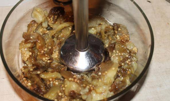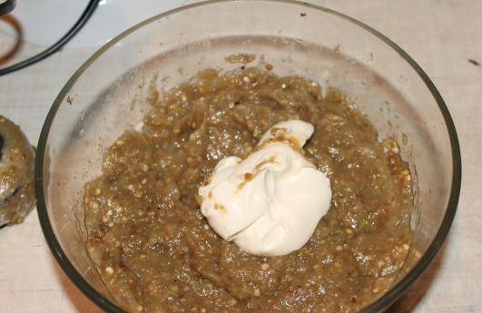 Dann werden die blauen, in kleine Stücke geschnitten, mit den restlichen Zutaten kombiniert und mit einem Mixer geschlagen, um eine homogene, zarte Konsistenz zu erhalten. Würzige Feinschmecker können Knoblauch nach Belieben hinzufügen.