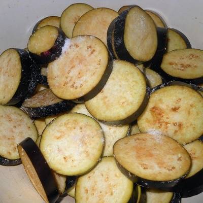 Super schnelle Beseitigung der Bitterkeit. Das geschnittene Gemüse mit Salz bestreuen. Sie können Steinsalz oder Jodsalz verwenden. Nach 16-20 Minuten werden die blauen gewaschen und getrocknet.