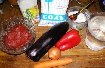 - Zuerst die Zwiebeln in einer Pfanne braten, dann die Karotten hinzufügen. Die nächste Zutat zum Braten ist Aubergine. Mit der Zeit einen Strohhalm aus zwei Paprikaschoten, Salz und Zucker in die Gemüsemischung geben.