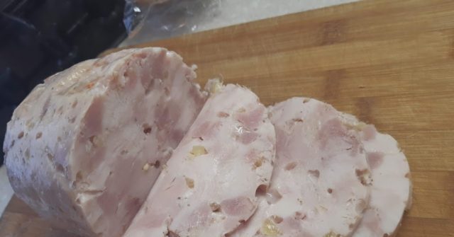 Die resultierende Masse wird auf einem Blatt Frischhaltefolie verteilt und in eine Rolle gewickelt. Das Wasser in einem großen Topf erhitzen. Die resultierende Wurst wird in kochendes Wasser getaucht und je nach Enddicke 50-60 Minuten gekocht. Das fertige Produkt wird 15 bis 20 Minuten in Wasser belassen, danach abgekühlt und über Nacht in den Kühlschrank gestellt.