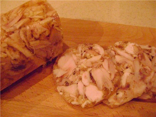 Das Huhn wird in kleine Stücke geschnitten oder in einem Fleischwolf gedreht. Es wird mit Gewürzen und Gelatine gemischt. Legen Sie die resultierende Masse in einen Backbeutel und legen Sie sie auf ein gefettetes Backblech. Die zukünftige Wurst wird 40 Minuten lang in einen auf 180 Grad vorgeheizten Ofen gestellt. Die fertige Delikatesse wird abgekühlt und 5-6 Stunden in den Kühlschrank gestellt, bis die Gelatine vollständig erstarrt ist.