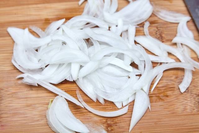 Zwiebeln werden von Schuppen geschält und in dünne Halbringe geschnitten. Nach der Reinigung wird der Knoblauch auf bequeme Weise zerkleinert.