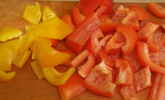 Gleichzeitig wird die Paprika gewaschen und von den Schwänzen und Samenkammern gereinigt. Es ist in ziemlich große Stücke geschnitten - eine Frucht ist in 6-8 Teile geteilt.