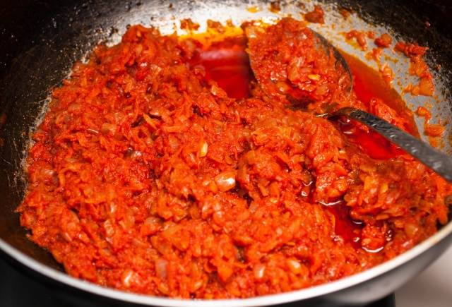 Anstelle von frischen Tomaten ist Tomatenmark großartig. Vor dem Kochen sollte es mit Wasser verdünnt werden, um eine Masse zu erhalten, die flüssiger Sauerrahm ähnelt. Es ist wichtig, die Zusammensetzung der Paste zu betrachten. Es sollte keine Konservierungsstoffe enthalten. Die Paste selbst hat ausgezeichnete konservierende Eigenschaften.