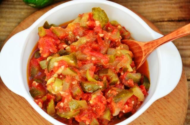 Tomaten und Paprika wie im ersten Rezept schälen und hacken. Anschließend wird das Gemüse mit einem Fleischwolf oder einem anderen Küchengerät zerkleinert. Nun wird diese flüssige Masse auf den Herd gestellt und zum Kochen gebracht. Danach können Sie alle Gewürze zur Mischung hinzufügen. Ferner werden geschälte und gehackte Gurken zu der Schale gegeben. Der Salat wird weitere 10 Minuten gekocht, danach werden Sonnenblumenöl und Essig hineingegossen. Sobald das Gericht wieder kocht, wird das Feuer ausgeschaltet.