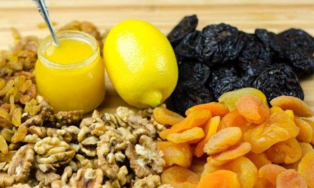 Eine Mischung aus getrockneten Aprikosen, Nüssen, Honig und Zitrone ist ein hervorragendes Mittel zur Stärkung der Immunität.