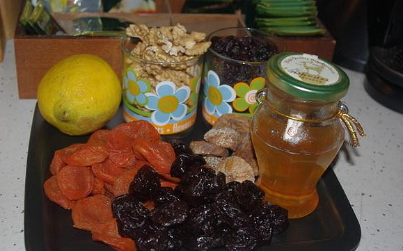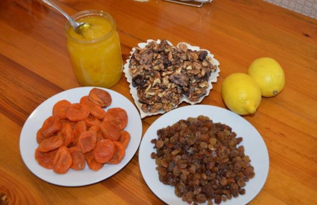 - Um ein Produkt aus getrockneten Aprikosen, Rosinen, Pflaumen, Walnüssen und Zitrone herzustellen, wird nur natürlicher Honig benötigt, daher sollte es von zuverlässigen Lieferanten gekauft werden.
