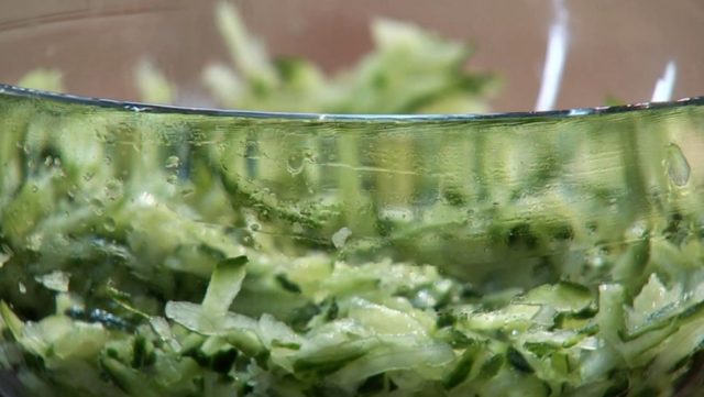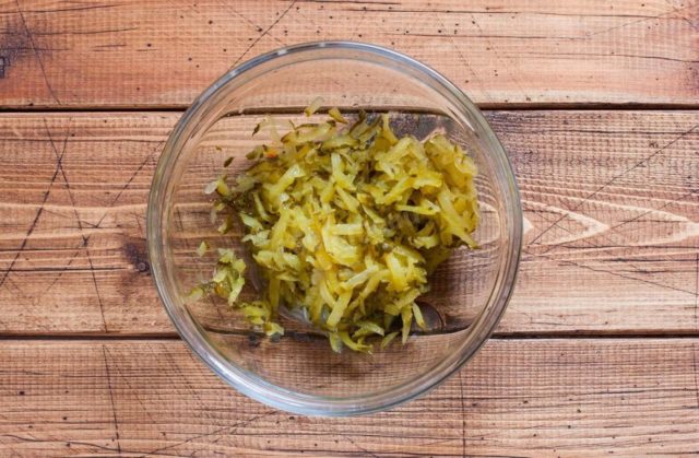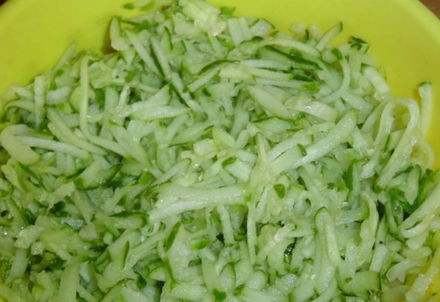 - Fügen Sie geriebene Gurken mit Salzlake zu den vorhandenen Zutaten hinzu.