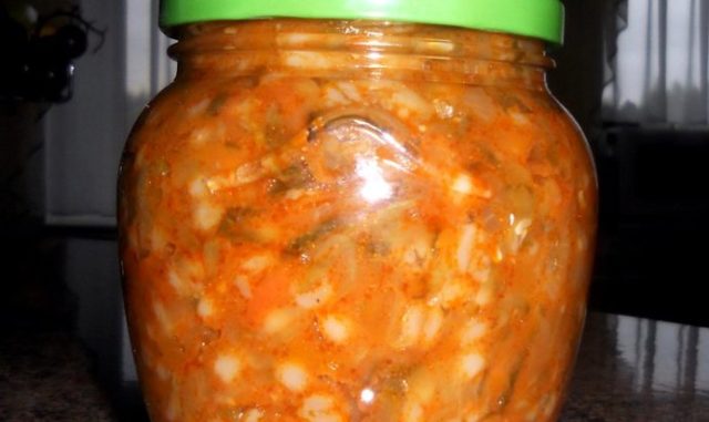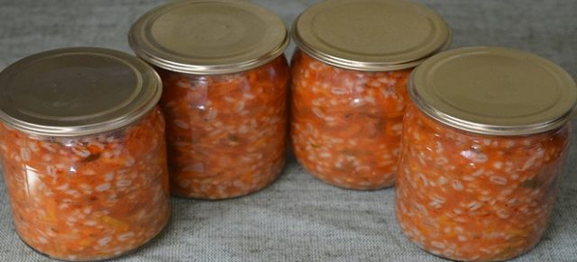 - Dann die gebräunte Mischung sowie die abgesetzten Gurken, 2 EL. Perlgerste und 0,5 kg Tomatenmark werden in einem Topf vermischt und eine halbe Stunde gekocht. Fügen Sie dabei 2-3 EL hinzu. l. Salz.