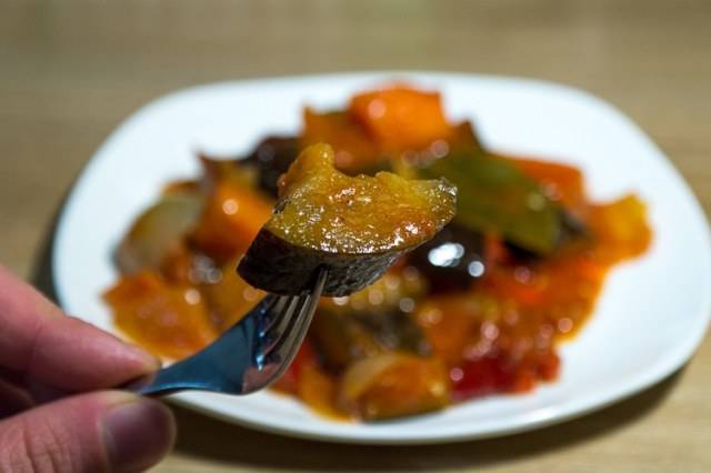 - Kombinieren Sie alle Komponenten: Auberginen, Paprika, geriebene Tomaten, Zwiebeln, Knoblauch, Sonnenblumenöl, Zucker, Salz.