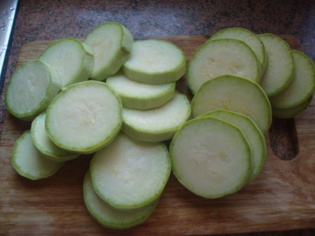 - Zucchini werden gewaschen, von Samen und Schalen befreit und in alte Ringe geschnitten, wenn die Früchte alt sind. Junge Früchte werden in Kreise geschnitten und hinterlassen die Haut.