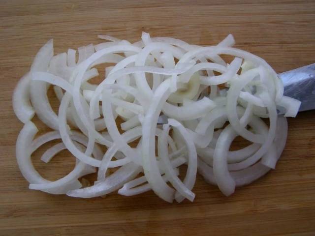 - Die Zwiebel schälen und in halbe Ringe schneiden.