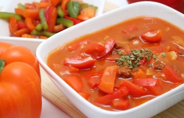 - Alles gut mischen und bei schwacher Hitze etwa eine halbe Stunde köcheln lassen. Wenn der Lecho dünn schien, wird die Garzeit verlängert, der Deckel wird entfernt.