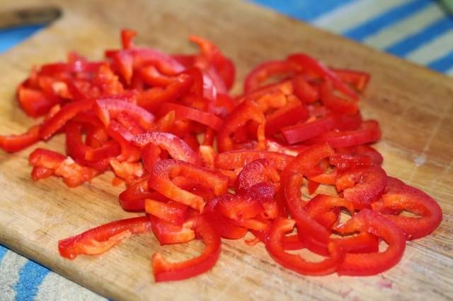 - Pfeffer wird gewaschen, Samen und Stiele werden entfernt, in Quadrate oder Streifen geschnitten.