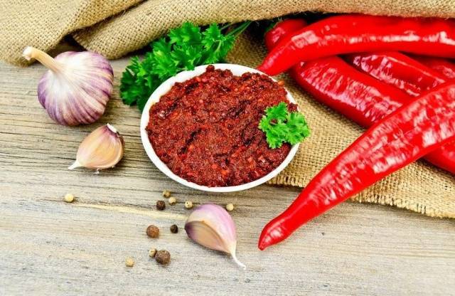 Adjika ist heute ein internationales Gewürz, das in fast jeder Familie mit Fleisch, Fischgerichten, Suppen und Nudeln serviert wird. Wie man dies würzig und aromatisch zubereitet Soße sehr viele. Mit welchem Gemüse und Obst kochen Adjika nicht. Aber die Basis sind immer noch Peperoni und Knoblauch, manchmal Meerrettich.