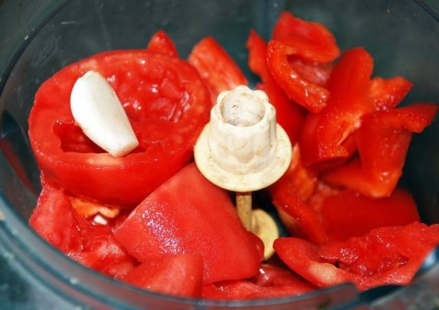 - Bereiten Sie einen Mixer vor und mahlen Sie zuerst beide Paprikasorten. Gießen Sie sie in einen großen Behälter.