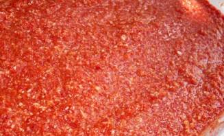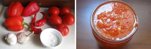 - Gießen Sie das Tomaten-Knoblauch-Püree in die Paprika. Es bleibt Salz und Essig hinzuzufügen. Mischen Sie die Masse gründlich, damit alle Komponenten kombiniert werden. Eine halbe Stunde ruhen lassen, bis sich das Salz vollständig aufgelöst hat, und in die Gläser geben.