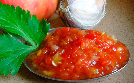 Adjika in dieser Komposition kann problemlos ein Jahr gelagert werden. Würzige, frische Sauce eignet sich hervorragend für Pasta, Fleisch, Fisch, verschiedene Müsli und Salate. Heiße Zutaten sind ein hervorragendes Instrument zur Vorbeugung von Infektionskrankheiten während der Wintersaison.