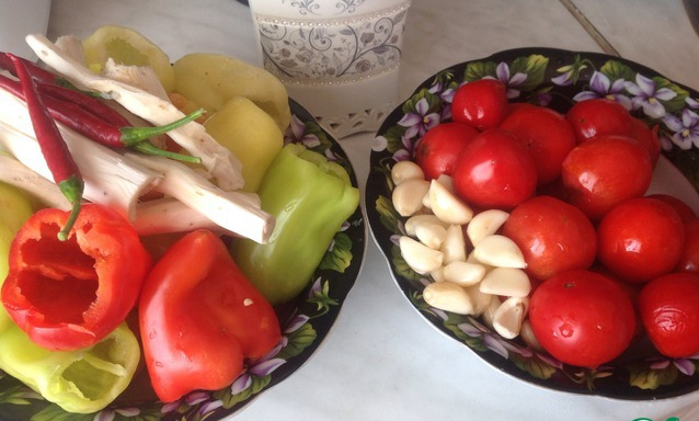 - Tomaten, Paprika, geschälte Meerrettichwurzeln und Knoblauchzehen durch einen Fleischwolf geben.