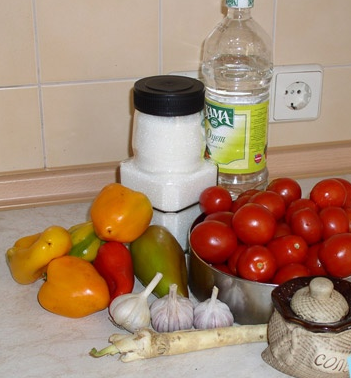 Für manche Menschen ist das Trinken von Essig unerwünscht oder inakzeptabel. Ihnen kann ein Rezept für die Herstellung von Adjika ohne Essigsäure empfohlen werden. Dank der großen Menge an Salz, Knoblauch und Meerrettich behält es seine Frische. Für die Zubereitung von frischem Adjika benötigen Sie also 5 kg Tomaten, Paprika in einer Menge von 1 kg.Zusätzlich zu diesen Zutaten benötigen Sie 1-2 Schoten Peperoni, 4-6 mittelgroße Meerrettichwurzeln, 5-6 Knoblauchzehen und 100 g Salz. Mit diesen Produkten können Sie mit minimalem Aufwand 5 Liter frische Adjika für den Winter vorbereiten.
