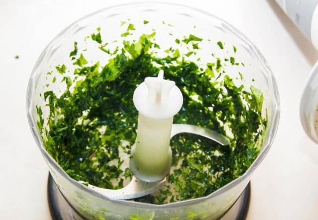 Schritt fünf. Wir waschen die Kräuter in mehreren Gewässern, schälen den Knoblauch und mahlen sie mit einem Mixer.