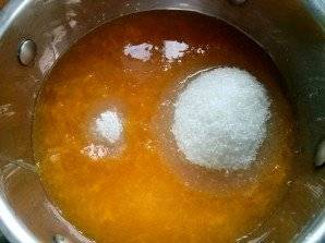 Salz, Kristallzucker zu den Kartoffelpürees geben und eine Viertelstunde bei niedriger Temperatur kochen lassen. Die Masse mit Kirschpflaume muss ständig gerührt werden, damit sie nicht am Boden der Pfanne klebt.
