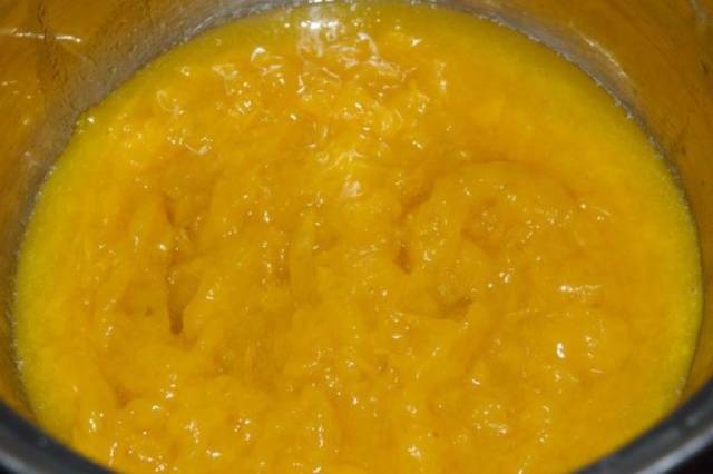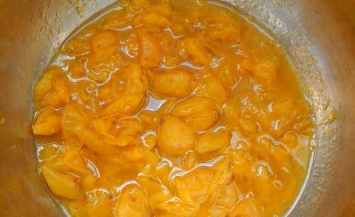Das Anfangsstadium fällt fast vollständig mit dem ersten Rezept zusammen: Rote oder rosa Kirschpflaumen werden gekocht, püriert und in Brand gesetzt.