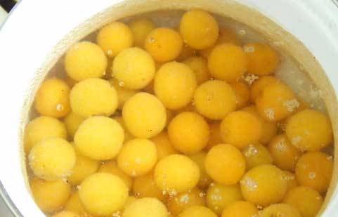 Wir nehmen die gelbe Kirschpflaume mit einem geschlitzten Löffel heraus und geben sie in ein Sieb, so dass die Flüssigkeit Glas ist.