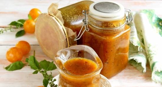 Wie bereits erwähnt, kann das Gewürz für Fleisch und Geflügel aus roten Kirschpflaumen gekocht werden. Wir bieten Ihnen eines der Rezepte zur Vorbereitung auf den Winter.