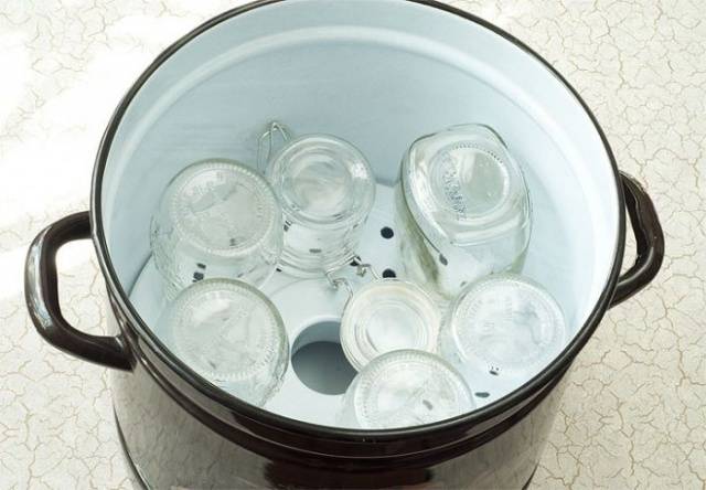 Es ist praktisch, kleine Gläser auf folgende Weise zu sterilisieren: Behälter mit einem halben Liter oder einem Liter Glas. Der Punkt ist, dass bei der Sterilisation die Dosen in einem großen Topf gekocht werden, in den sie vollständig passen.