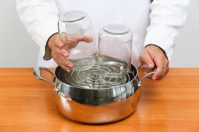 Dampfbehälter können auch im Topf sterilisiert werden. Stellen Sie dazu einen kleinen Rost oder Metalldeckel auf den Boden, damit die Glasbehälter die Pfanne selbst nicht berühren. Die Gläser werden mit dem Hals nach unten auf den Rost gestellt, ein wenig Wasser wird in den Boden der Pfanne gegossen. Während des Kochvorgangs wäscht der Dampf die Innenfläche des Glasbehälters und reinigt ihn effizient. Der Vorteil dieser Methode ist die Tatsache, dass sich der Dampf im Hohlraum der Dosen ansammelt und die Luftfeuchtigkeit im Raum nicht erhöht. Decken Sie den Topf auf Wunsch mit einem Deckel ab.