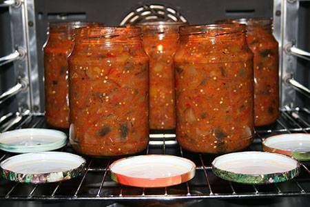 - Decken Sie die zuvor gewaschenen und mit dem fertigen Produkt gefüllten Dosen mit Deckeln (nicht fest) ab und legen Sie sie auf einen Rost oder ein Backblech.