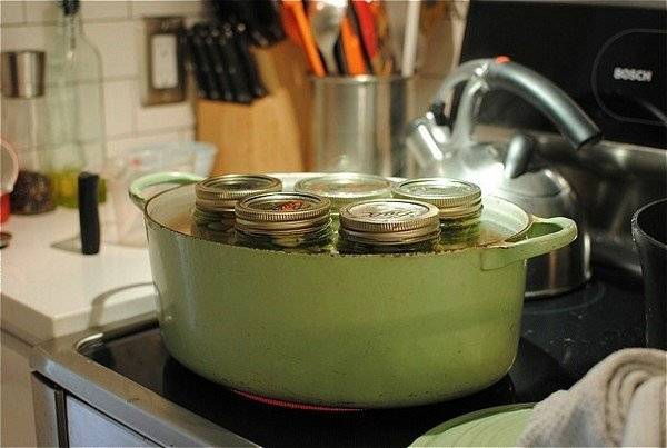 Bereiten Sie während dieser Zeit sterile Gläser vor, vorzugsweise kleine, etwa einen Liter. Die Mischung aus Gemüse und Äpfeln in Gläser teilen und mit Salzlake bedecken. Zum Schluss müssen die Salatgläser ca. 20 Minuten sterilisiert und erst dann aufgerollt werden.