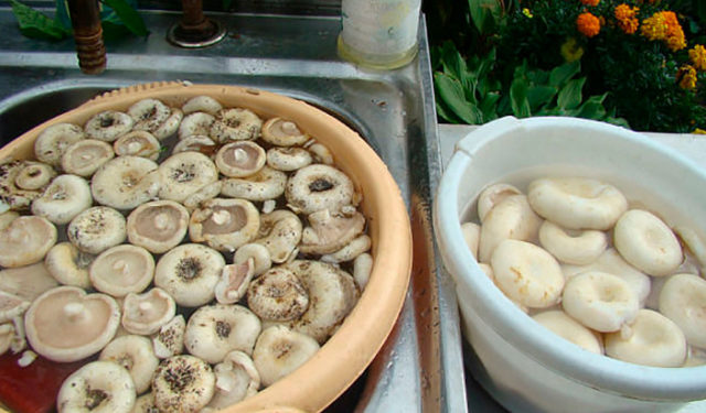 - Pilze müssen mehrere Stunden (nicht länger als 4-5) in leicht angesäuertem und gesalzenem Wasser eingeweicht werden. Dies wird dazu beitragen, den unangenehmen bitteren Geschmack zu beseitigen und die weitere Reinigung zu erleichtern. Wenn die Pilze jedoch jung sind, müssen Sie dies nicht tun, da die Bitterkeit während des Kochvorgangs vor dem Einlegen verschwindet. Darüber hinaus schätzen manche Menschen Podgruzdki gerade wegen ihres leicht spezifischen Geschmacks.