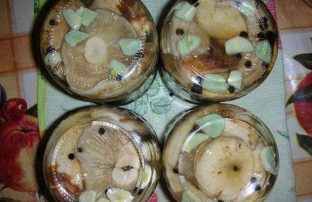 - Legen Sie die gekochten Pilze in einen Behälter, legen Sie Knoblauch und ein Meerrettichblatt darauf, gießen Sie dann kochende Salzlösung ein und stellen Sie die Unterdrückung ein. 4-6 Tage an einem kühlen Ort aufbewahren.