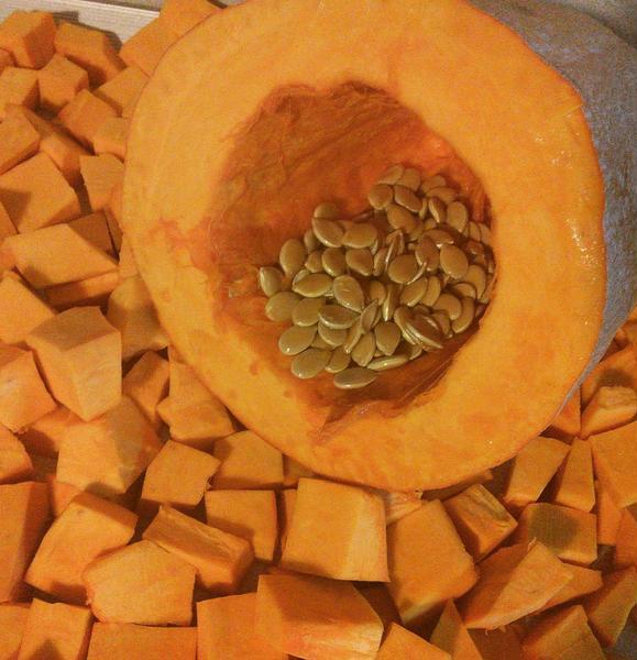 - Das Kürbisfleisch in kleine Würfel schneiden.