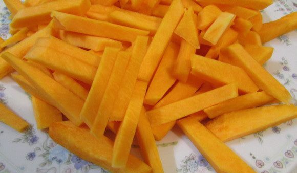 Das verbleibende Kürbispulpe wird in Stücke von geeigneter Größe und Form geschnitten: Würfel, Streifen oder Scheiben, deren Dicke 3 cm nicht überschreiten sollte.