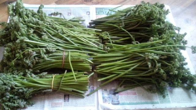 Die Sprossen, die zum Zwecke der Ernte für den Winter geerntet werden, sollten nicht mehr als 30 cm betragen, während der Spross während der Ernte nicht am Boden selbst, sondern etwa 5 cm davon abgeschnitten werden sollte. Nach der Ernte werden die Rachis nach Farbe und Länge sortiert. Die sortierten Sprossen werden in Bündeln gesammelt, die oben ausgerichtet sind. Dann werden die Bündel gebunden und die Enden genau geschnitten. Die Haltbarkeit in Bündeln nach der Entnahme sollte 10 Stunden nicht überschreiten. Um alle nützlichen und geschmacklichen Eigenschaften zu erhalten, wird empfohlen, spätestens 2-3 Stunden nach der Ernte für den Winter zu ernten.