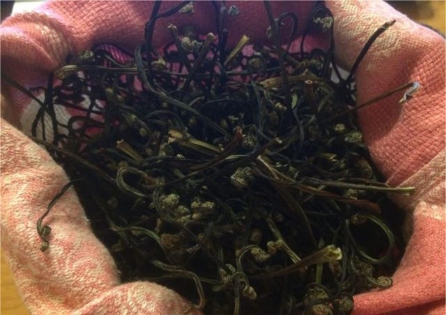 Das Trocknen in elektrischen Trocknern ist eine schnellere Art der Ernte. Genau wie beim natürlichen Trocknen können die Blattstiele nach dem Kochen abkühlen und leicht trocknen. Nachdem sie in einer gleichmäßigen Schicht auf einer elektrischen Trocknerschale ausgelegt und 6 Stunden lang bei einer Temperatur von +50 Grad getrocknet wurden.