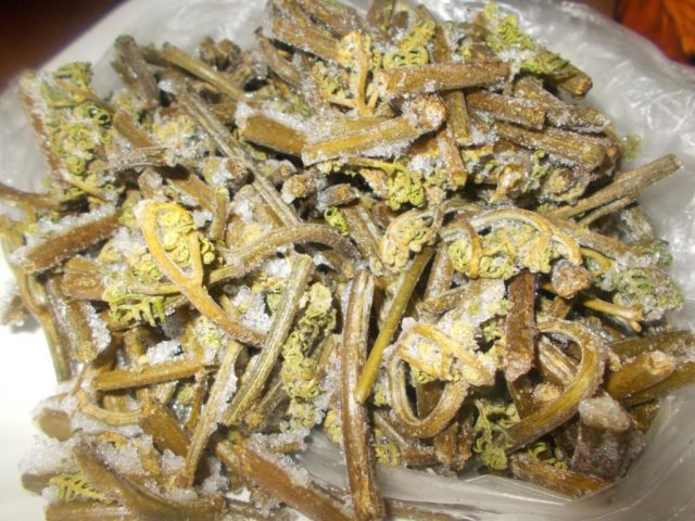 Zusätzlich zum Trocknen und Beizen kann Adlerfarn durch Einfrieren hergestellt werden. Der Gefrierprozess unterscheidet sich in seiner Komplexität nicht vom Trocknen, er wird wie folgt durchgeführt: