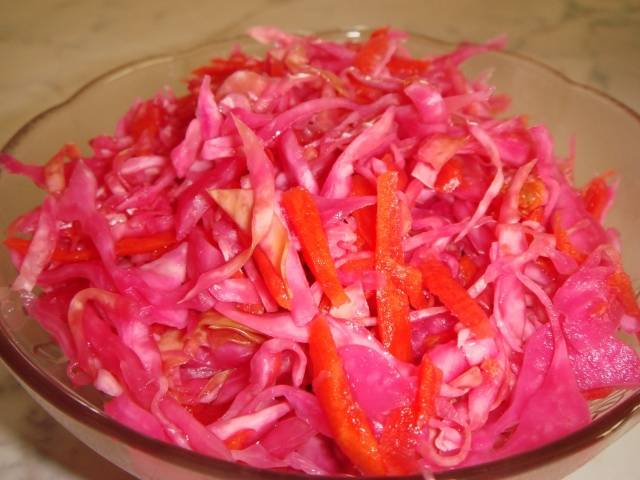 - Während die Marinade abkühlt, können Sie Kohl (2 kg) und Karotten (1 Stk.) Schneiden.