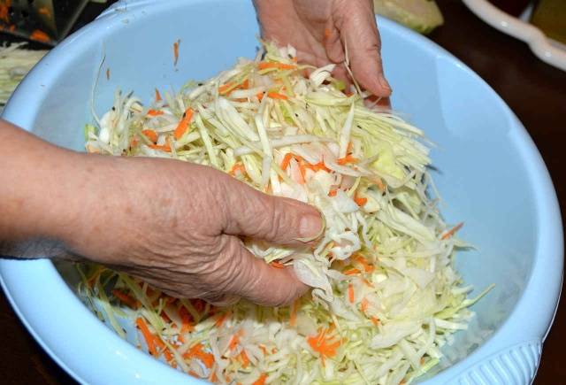 - Das Gemüse wird gemischt und muss mit den Händen zerdrückt werden.