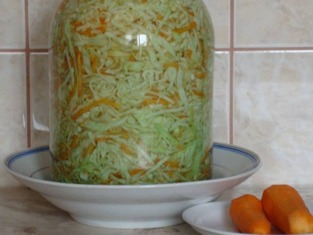 - Sauerkraut in einem Glas für 3 Tage. Zuerst müssen Sie eine tiefe Platte darunter legen.