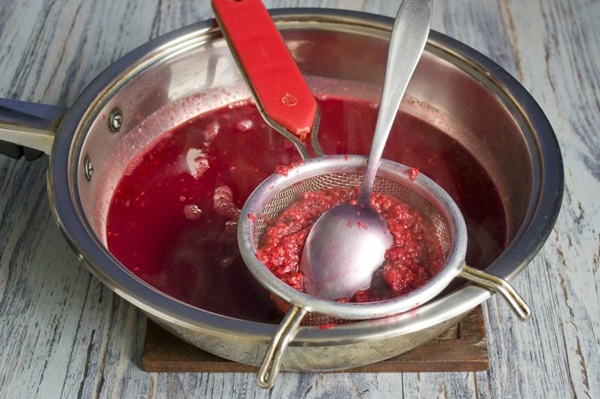 Mahlen Sie die Beeren mit einem Mixer. Fügen Sie der dicken Himbeermasse kaltes Wasser (1 Tasse) hinzu und passieren Sie ein Sieb. Entsorgen Sie die restlichen Knochen. Das Ergebnis ist ein dicker, fleischiger Himbeersaft.
