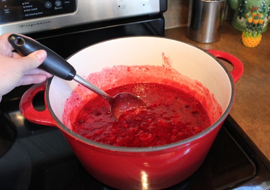 Die resultierende Beerenmasse muss gewogen werden. Sie sollten 0,9 kg bekommen. Stellen Sie einen Topf mit Himbeersaft auf das Feuer und kochen Sie ihn auf etwa 0,6 kg (35-40%). 600 g Zucker in die reduzierte Masse geben und 5 Minuten kochen lassen. Dann abkühlen lassen und erneut kochen.