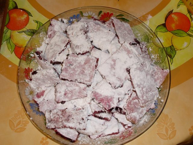 Das fertige Gericht ist mäßig süß. Wenn Sie den Marshmallow mit schwarzen Johannisbeeren mit Puderzucker bestreuen, kleben die Leckerbissen nicht zusammen.