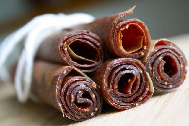 Mit dem elektrischen Trockner können Sie die vorteilhaften Eigenschaften und den Geschmack von Beeren und Früchten bewahren. Solche Geräte sind mit Paletten mit Seiten ausgestattet, auf denen die Fruchtmasse platziert wird. Die Zubereitung eines Desserts in einem elektrischen Trockner dauert durchschnittlich 12 Stunden.